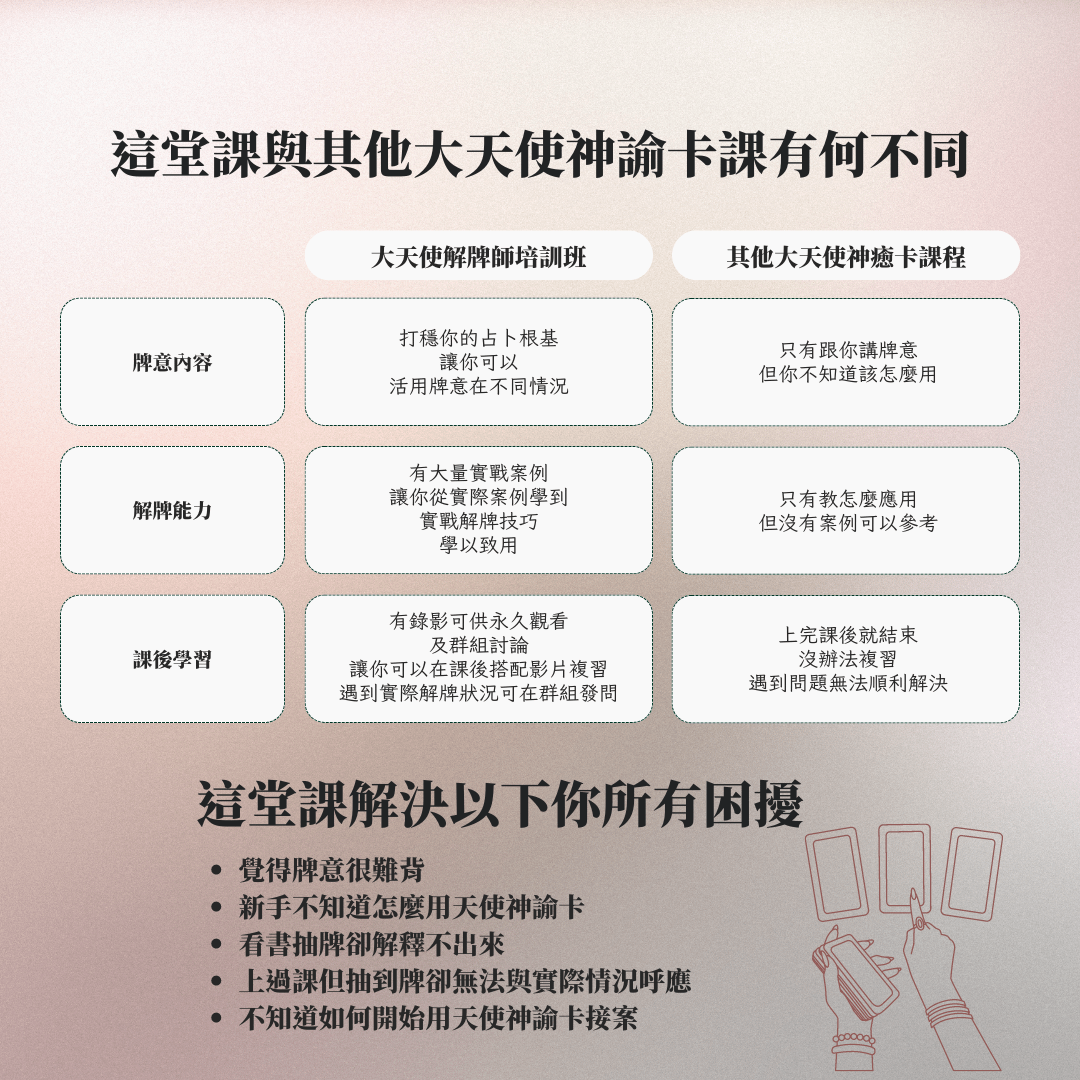 如果你感受到天使的指引,心中有一股力量促使你想要參加這堂課,那麼這就是你的靈魂在呼喚你!如果你想了解大天使如何在生活中協助你,或者學習如何解讀大天使神諭卡,那麼請聽從內心深處的聲音,來參加我們的「天使解牌師培訓班」吧,相信你會有豐富的收穫!