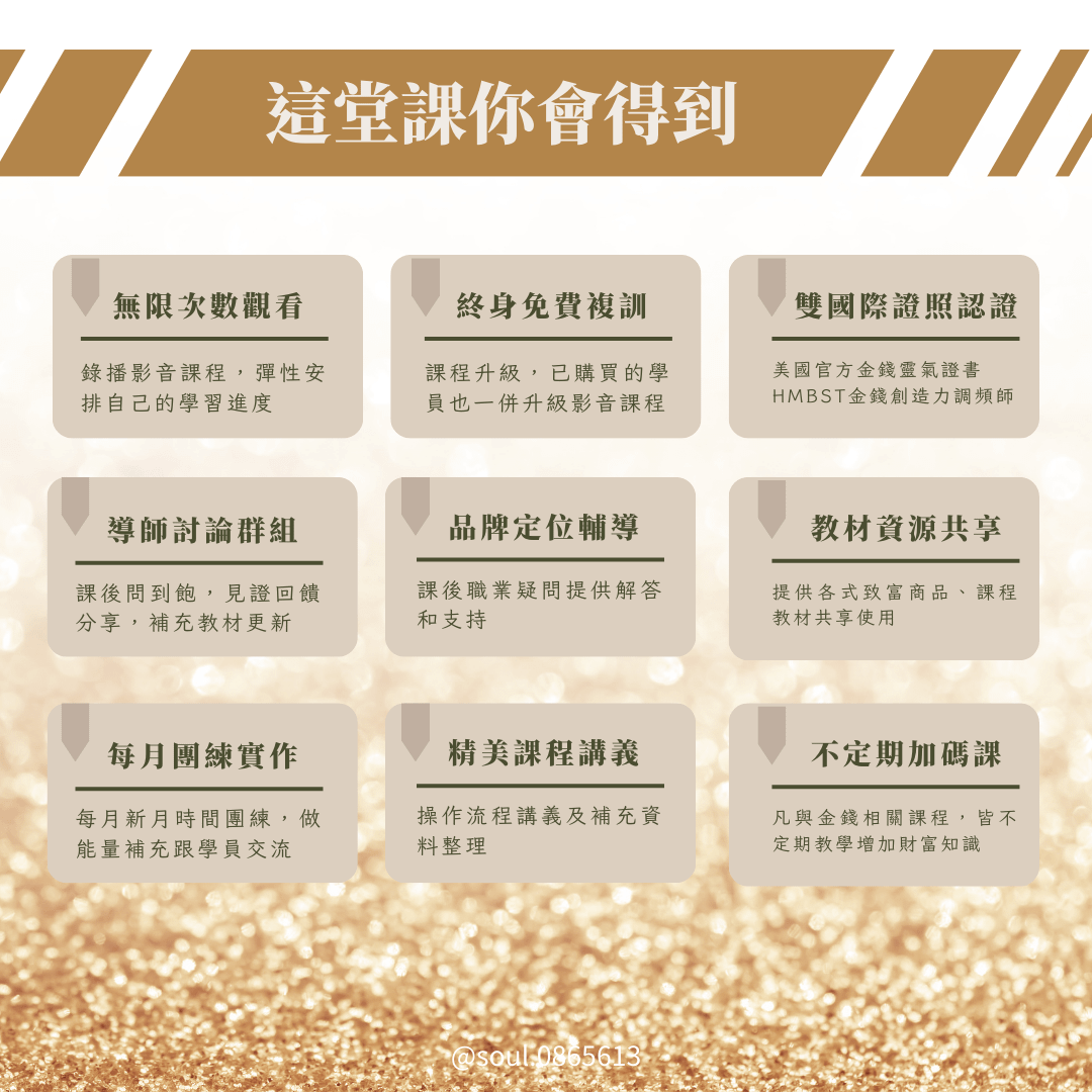 ☑ 一筆學費學會多種技能,課程可學習透過療癒接個案/教學成為講師/理財規劃觀念/招財商品販售/社群媒體運作⋯適合少預算但渴望學習的你